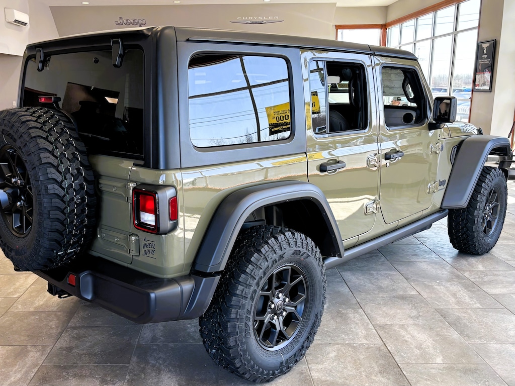 Vehicle is equipped with: Convenience Group (2-Door Passive Entry, Front Door Locks, Air Conditioning with Auto Temp Control, Air Filtering, Cluster 7.0" TFT Color Display, Emergency/Assistance Call, Heated Front Seats, Heated Steering Wheel, and Universal Garage Door Opener), Quick Order Package 22W Willys (4-Wheel Drive Swing Gate Decal, 7 and 4 Pin Wiring Harness, Advanced Brake Assist, Automatic Headlamps, Auxiliary Switches, Black Grille with Gloss Black Rings, Class II Receiver Hitch, Conventional Differential Front Axle, Corning Gorilla Glass, Dana M210 Wide HD Tube Front Axle, Dana M220 Wide Rear Axle, Daytime Running Lamps LED Accents, Deep Tint Sunscreen Windows, E-Locker Rear Axle, Enhanced Adaptive Cruise Control, Front LED Fog Lamps, Full Speed Forward Collision Warning Plus, Increased Travel Export Tuned Suspension, Injection Molded Black Rear Bumper, LED Premium Reflector Headlamps, Mold in Color Bumper with Gloss Black, Molded in Color Rubicon Highline Flare, MOPAR All-Weather Floor Mats, Off-Road Plus Mode, Power Heated Mirrors, Premium Wrapped Steering Wheel, Security Alarm, Sun Visors with Illuminated Vanity Mirrors, Wheels: 17" x 7.5" Painted Black, and Willys Hood Decal), 12.3" Touchscreen Display, 4-Wheel Disc Brakes, 4G LTE Wi-Fi Hot Spot, 8 Speakers, ABS brakes, Air Conditioning, AM/FM radio: SiriusXM with 360L, Apple CarPlay, Apple CarPlay/Android Auto, Aux Battery, Black 3-Piece Hard Top, Brake assist, Compass, Connectivity - US/Canada, Delay-off headlights, Driver door bin, Driver vanity mirror, Dual front impact airbags, Dual front side impact airbags, Electronic Stability Control, For More Info, Call 800-643-2112, Freedom Panel Storage Bag, Front anti-roll bar, Front Bucket Seats, Front Center Armrest w/Storage, Front fog lights, Front reading lights, Google Android Auto, Illuminated entry, Integrated Center Stack Radio, Integrated roll-over protection, Low tire pressure warning, No Soft Top, Non-Lock Fuel Cap Without Discriminator, Normal Duty Suspension, Occupant sensing airbag, Outside temperature display, Overhead airbag, Panic alarm, ParkView Rear Back-Up Camera, Passenger door bin, Passenger vanity mirror, Power steering, Power windows, Radio data system, Radio: Uconnect 5 with 12.3" Display, Rear anti-roll bar, Rear reading lights, Rear Window Defroster, Rear Window Wiper/Washer, Remote keyless entry, SiriusXM Radio Service, SiriusXM with 360L, Speed control, Split folding rear seat, Steering wheel mounted audio controls, Stop-Start Dual Battery System, Tachometer, Telescoping steering wheel, Tilt steering wheel, Traction control, Trip computer, Variably intermittent wipers, and Wheels: 17" x 7.5" Black Steel Styled.