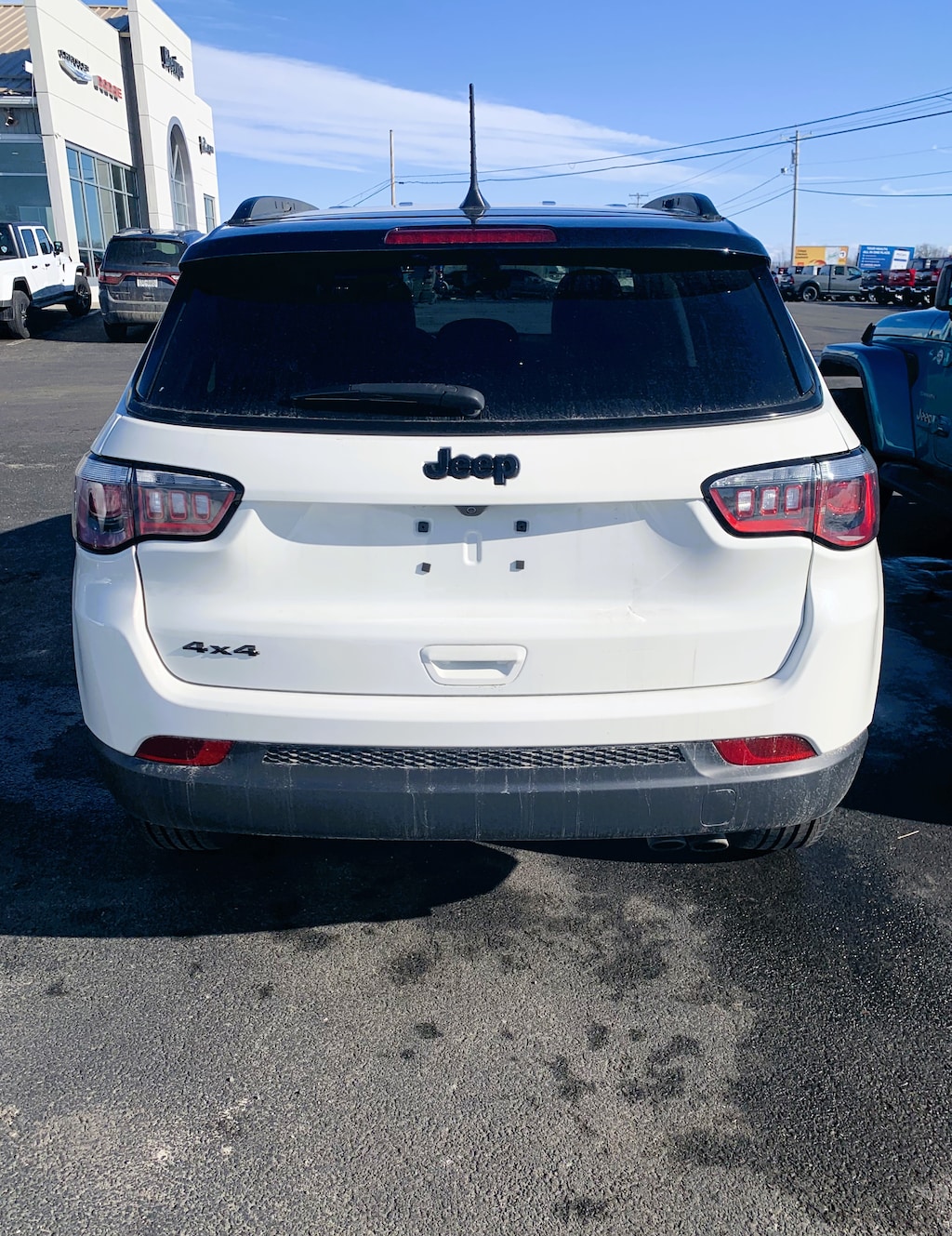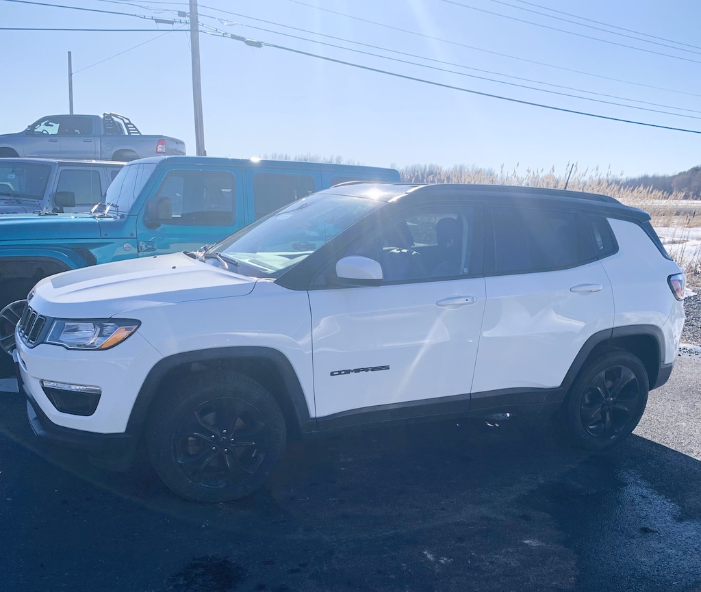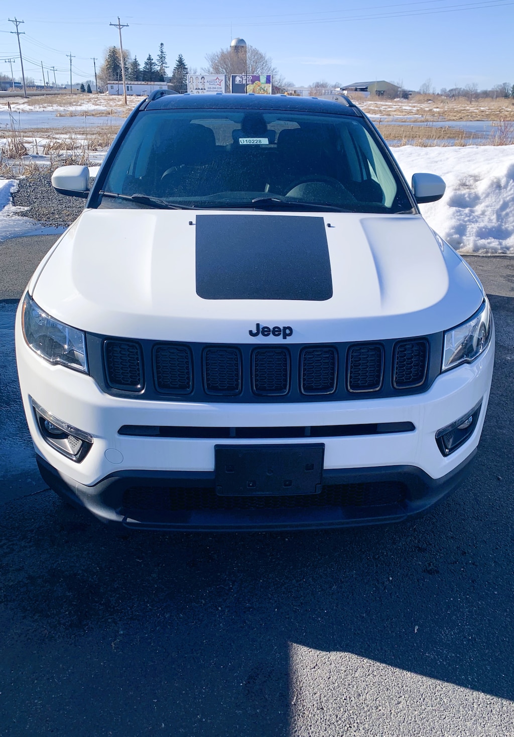 White Clearcoat 2019 Jeep Compass Altitude 4WD 9-Speed Automatic 2.4L I4 Vehicle is equipped with: Cold Weather Group (Windshield Wiper De-Icer), Quick Order Package 27B Altitude (DISC) (Altitude Special Edition, Black 4x4 Tailgate Badge, Black Day Light Opening Moldings, Bright Exhaust Tip, Gloss Black Lower Rear Fascia Valance, and Piano Black Interior Accents), 3.833 Axle Ratio, 4-Wheel Disc Brakes, 6 Speakers, ABS brakes, Air Conditioning, Alloy wheels, AM/FM radio: SiriusXM, Anti-whiplash front head restraints, Automatic temperature control, Brake assist, Bumpers: body-color, Compass, Delay-off headlights, Driver door bin, Driver vanity mirror, Dual front impact airbags, Dual front side impact airbags, Electronic Stability Control, Four wheel independent suspension, Front anti-roll bar, Front Bucket Seats, Front Center Armrest w/Storage, Front dual zone A/C, Front fog lights, Front reading lights, Fully automatic headlights, Heated door mirrors, Illuminated entry, Knee airbag, Low tire pressure warning, Occupant sensing airbag, Outside temperature display, Overhead airbag, Overhead console, Panic alarm, ParkView Rear Back-Up Camera, Passenger door bin, Passenger vanity mirror, Power door mirrors, Power steering, Power windows, Premium Cloth/Vinyl Bucket Seats, Radio: Uconnect 4 w/7" Display, Rear anti-roll bar, Rear seat center armrest, Rear window defroster, Rear window wiper, Remote keyless entry, Roof rack: rails only, Speed control, Split folding rear seat, Spoiler, Steering wheel mounted audio controls, Tachometer, Telescoping steering wheel, Tilt steering wheel, Traction control, Trip computer, Variably intermittent wipers, and Wheels: 17" x 7.0" Silver Painted Aluminum.