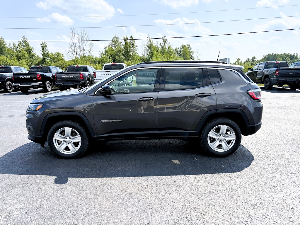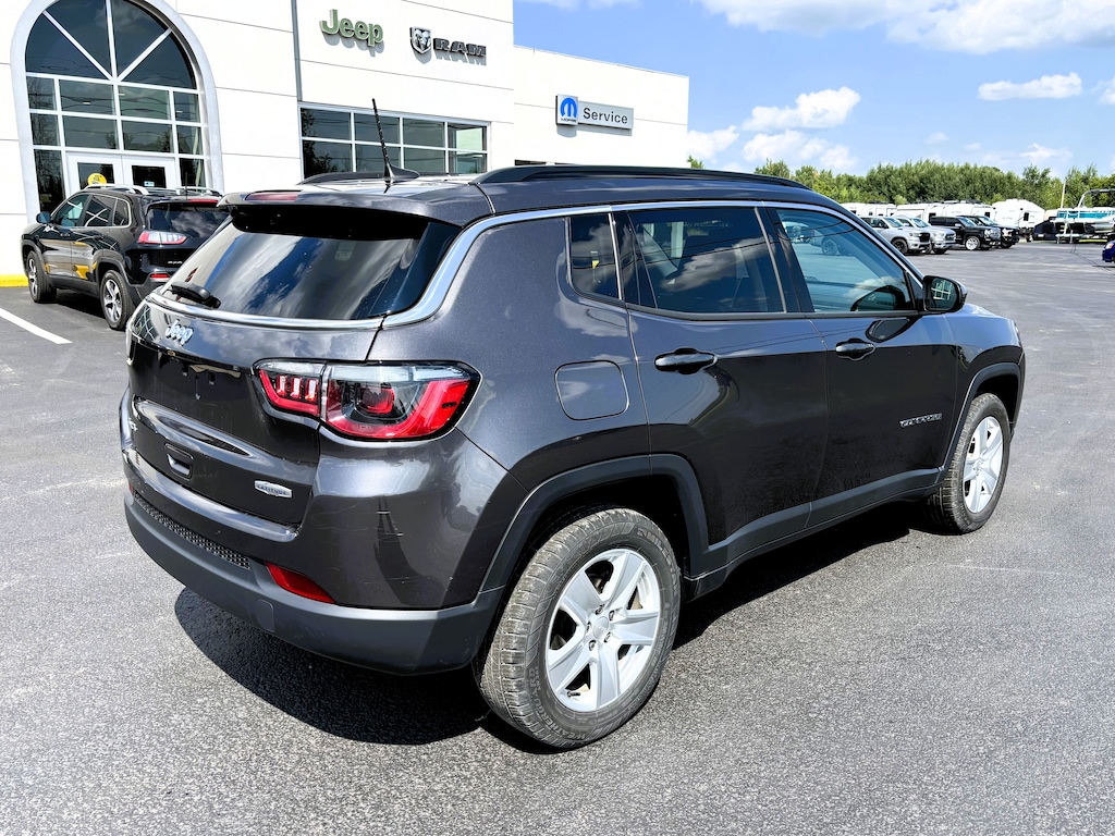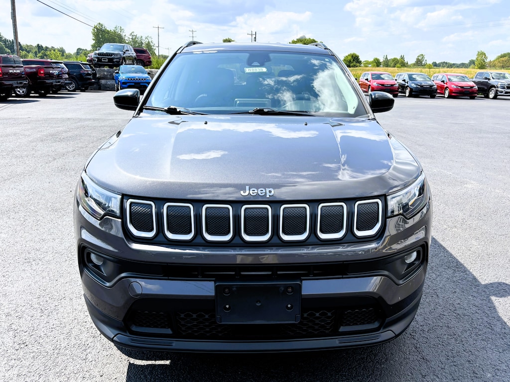 Granite Crystal Metallic Clearcoat 2022 Jeep Compass Latitude 4WD 9-Speed 948TE Automatic 2.4L I4 Vehicle is equipped with: Quick Order Package 2GJ, 17" x 7" Painted Aluminum Wheels, 3.73 Axle Ratio, 4-Wheel Disc Brakes, 6 Speakers, ABS brakes, Air Conditioning, Alloy wheels, AM/FM radio: SiriusXM, Anti-whiplash front head restraints, Auto High-beam Headlights, Brake assist, Bumpers: body-color, Compass, Delay-off headlights, Driver door bin, Driver vanity mirror, Dual front impact airbags, Dual front side impact airbags, Electronic Stability Control, Emergency communication system: SiriusXM Guardian, Four wheel independent suspension, Front anti-roll bar, Front Bucket Seats, Front Center Armrest w/Storage, Front fog lights, Front License Plate Bracket, Front reading lights, Fully automatic headlights, Heated door mirrors, Illuminated entry, Knee airbag, Leather Shift Knob, Low tire pressure warning, Occupant sensing airbag, Outside temperature display, Overhead airbag, Overhead console, Panic alarm, ParkView Rear Back-Up Camera, Passenger door bin, Passenger vanity mirror, Power door mirrors, Power steering, Power windows, Premium Cloth/Vinyl Bucket Seats, Radio: Uconnect 5 w/10.1" Display, Radio: Uconnect 5 w/8.4" Display (DISC), Rear anti-roll bar, Rear seat center armrest, Rear window defroster, Rear window wiper, Remote keyless entry, Roof rack: rails only, Speed control, Split folding rear seat, Spoiler, Steering wheel mounted audio controls, Tachometer, Telescoping steering wheel, Tilt steering wheel, Traction control, Trip computer, and Variably intermittent wipers.